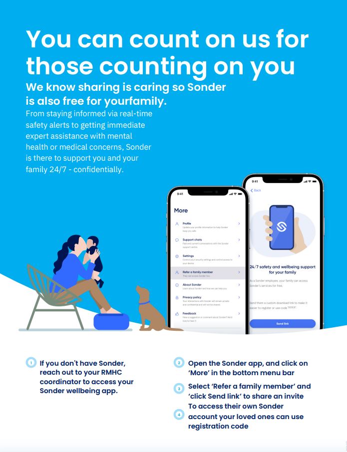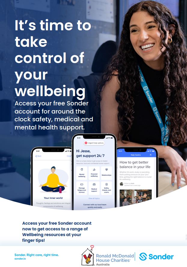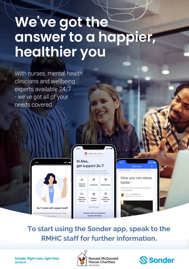 Sonder provides around-the-clock qualified and comprehensive support across safety, medical, and mental health. If you don’t have Sonder, reach out to your RMHC Northern NSW coordinator to arrange access to your Sonder wellbeing app.